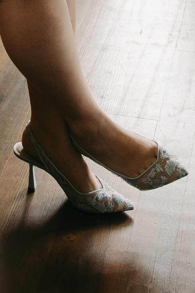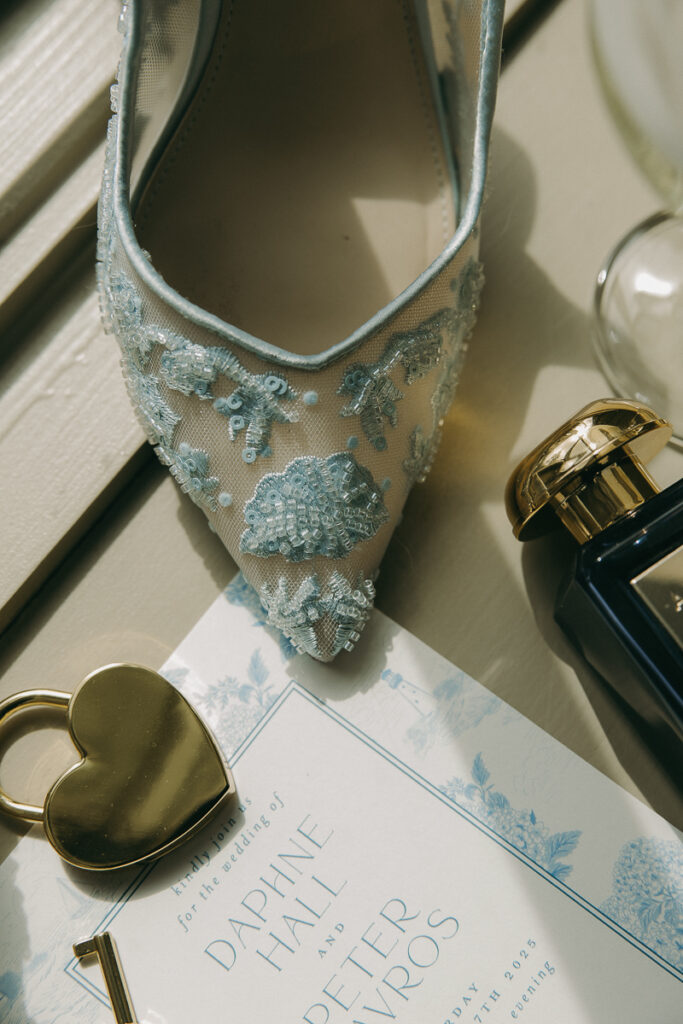 As always, I began with their detail photos. Their details were simple and elegant––white invitations with dainty blue floral patterns along the margins and a few other accents. Daphne’s “something blue” ended up being her bridal shoes, sling back kitten heels with mesh toes, adorned with blue embellishments. It definitely fit the theme for Oyster Bay Yacht Club Wedding, elements of the sea tied in with their personal moody style.